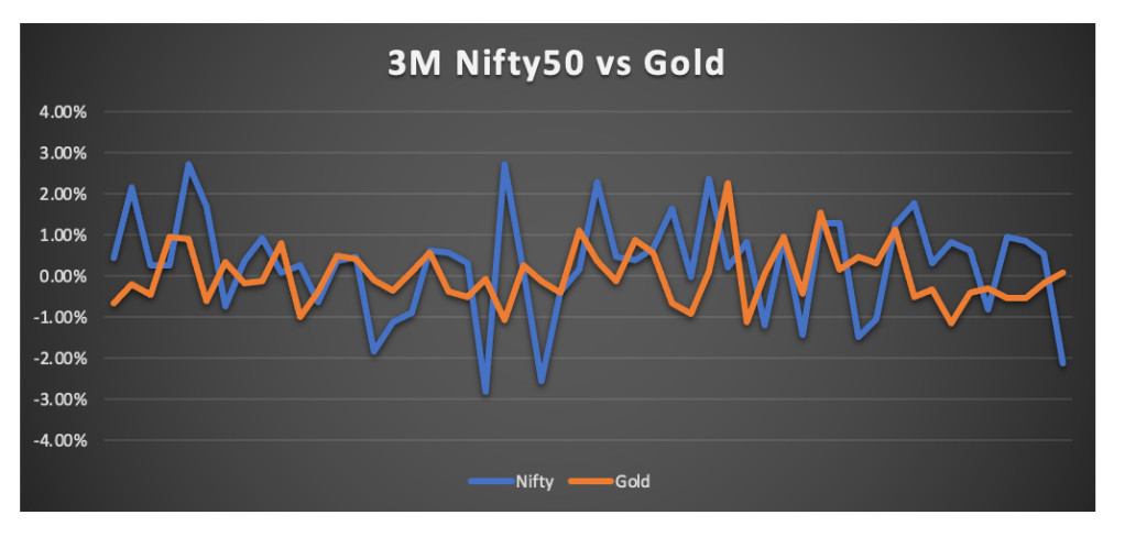 We have plotted the returns of Nifty50 vs 10years Bond. We see that while there are periods where the returns diverge and move in the opposite direction but mostly the returns move in the same direction thereby squashing the notion that “bonds are a good hedge in the long term scenario”. We have to understand one thing all asset derives their price from the economic conditions prevailing in the country. So when we are on the path of growth the price of both the equity and bond will rise, thereby moving in the same direction and vice versa.