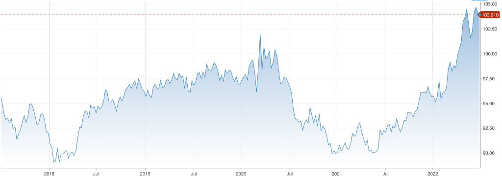 The index was set up after the dissolution of the Bretton Woods Agreement and is maintained by the Intercontinental Exchange (ICE). The basket of foreign currencies consists of six currencies depicting the regions with whom the US has crucial trading ties. The currencies are euro, Swiss franc, Swedish krona, British pound, Japanese yen, and Canadian dollar. The index gives us a fair indication of the USD value in the global market. We can see that it is trading above 100.